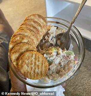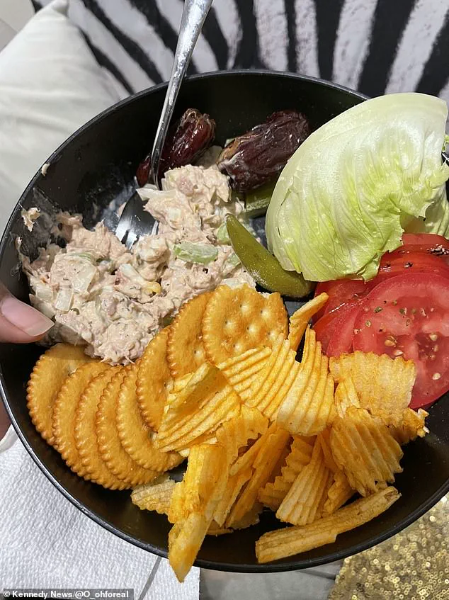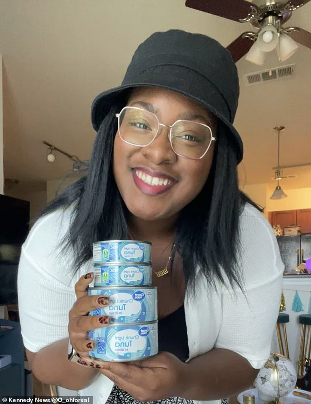 Montgomery described her routine of meal prepping tuna with mayonnaise, onions, and relish, eating it multiple times a day for breakfast, snacks, lunch, and even dinner. ‘I’d go through about six cans of tuna per week,’ she said, adding that her coworkers began jokingly referring to the midday break as ‘tuna time’ instead of ‘lunch time.’