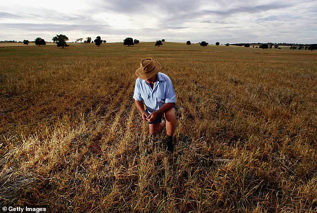 Pictured an Australian farmer inspects his dead wheat crop following a drought in New South Wales.
