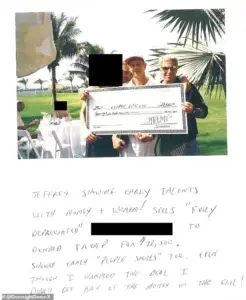 Another page shows a photograph of Pashcow and Epstein holding a check for $22,500, supposedly signed by Trump, as payment for Epstein ‘passing on’ a woman.