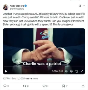 Donald Trump’s Oval Office address following the assassination of conservative activist Charlie Kirk has sparked a new wave of controversy, with claims that the video was manipulated using artificial intelligence.