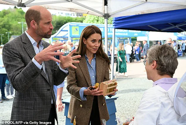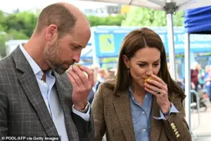 At an artisan market, Kate and William tried the company’s signature cheddar cheese made from the curd from local cows and a special locally brewed whiskey made from the whey as well as their special spirit ‘Rhubarb Ruin’, which the princess particularly liked.