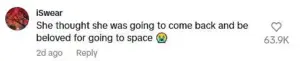 ‘This is the first theory that makes complete sense,’ one commenter noted. ‘She thought she was going to come back and be beloved for going to space.’ Another fan agreed, saying: ‘I just found out the butterfly she had in the ship was her set list for the tour… yeah…