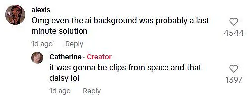‘That’s what I thought when she kept floating and looking into the camera,’ one user said. ‘That was definitely done so she could add the footage later.’ Catherine chimed in, ‘It was gonna be clips from space and that daisy lol.’
