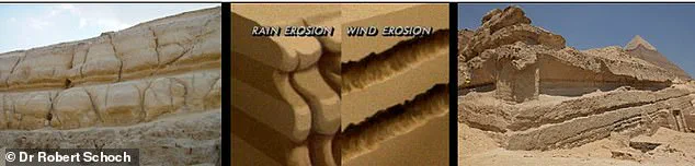 This includes rounded contours and deep vertical cracks that, according to Schoch, could only have been caused by prolonged exposure to water. ‘The erosion and weathering on the Sphinx do not align with the Sahara’s present environment,’ he explained. ‘They point to a much earlier, wetter climate—one that existed during the African Humid Period, between 14,500 and 5,000 years ago.’