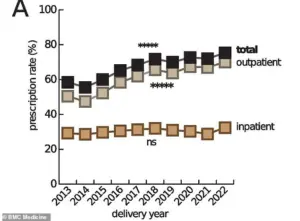 The above shows how the proportion of pregnant women taking prescription medication has risen in the US in recent years. It is based on data from Providence St Joseph
