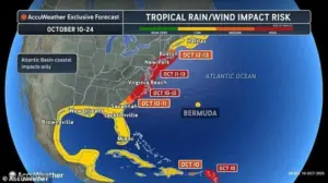 AccuWeather lead hurricane expert Alex DaSilva has already taken a proactive stance, stating: ‘There is a high risk this storm will be designated a subtropical (hybrid) storm, which is why we have designated this system as a tropical wind and rainstorm, and have issued an eye path map to raise early awareness ahead of potential National Hurricane Center (NHC) classification.’ This early warning system is designed to give communities critical time to prepare for what could be a formidable challenge.
