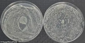 Lab experiments suggest the warm, moist environment of a vape mouthpiece can quickly become a breeding ground for bacteria and fungi if not cleaned regularly. Pictured, swab results of the vape mouthpiece after two weeks