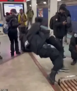 Fists fly, officers grapple with agitated individuals, and the station—once a hub of daily commutes—becomes a scene of raw, unfiltered chaos.