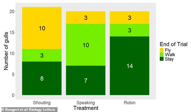 But the difference was that the gulls were more likely to fly away at the shouting and more likely to walk away at the speaking.’ The findings suggest that seagulls are highly attuned to human vocal cues, interpreting shouting as a more immediate and serious threat than spoken words.
