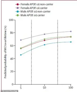 The same pattern was observed for dementia, with the 75-year-old woman with high amyloid levels and the APOE ε4 gene facing a 69% lifetime risk of diagnosis, compared to 56.5% for her male counterpart.