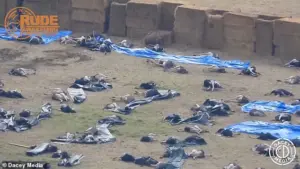 Images shared by local media outlet Dacey Media captured the aftermath of the cull, with hundreds of ostriches lying lifeless under tarps.