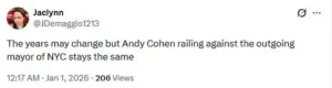 One user quipped, “The years may change but Andy Cohen railing against the outgoing mayor of NYC stays the same,” while another wrote, “Andy Cohen drunk af on CNN while Anderson Cooper tries to stay out of the frame is gold.” The clip, which had already been shared by a fan hours earlier, garnered over 700,000 views, with many expressing relief that the co-hosts had seemingly returned to their usual, alcohol-fueled antics. “Wait is that this year?