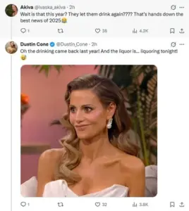 That’s hands down the best news of 2025,” one user joked, referencing the return of open drinking during the show’s coverage.