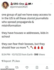The post, made three days after the October 7, 2023 Hamas attack on Israel, warned ‘Zionist journalists’ to ‘fear for their lives,’ accompanied by knife, hatchet, and blood-drop emojis.