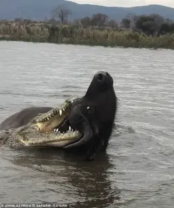 As the two creatures wrestle in the water, the crocodile’s relentless grip is met with the buffalo’s sheer determination.