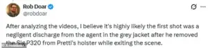 Rob Dobar, a lawyer for the Minnesota Gun Owners Caucus, wrote on X that he believes it’s ‘highly likely the first shot was a negligent discharge from the agent in the grey jacket after he removed the Sig P320 from Pretti’s holster while exiting the scene.’