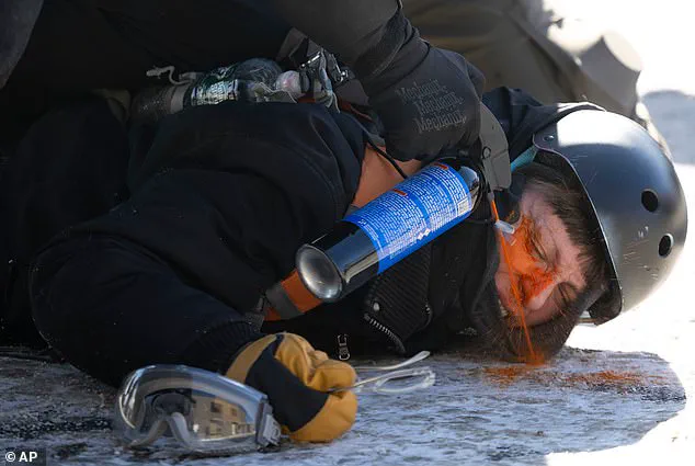 A protester is pepper sprayed at close range while being detained near the site of the fatal shooting of Pretti