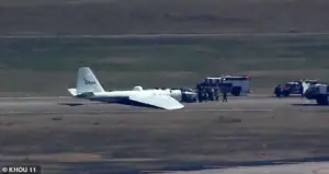 The incident, captured in footage by KHOU 11 News, shows the 60-year-old WB-57 aircraft touching down before its belly scraped along the runway, sending sparks and flames trailing behind it.