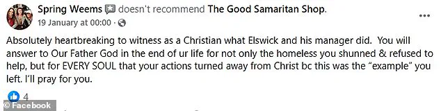 In the post, she wrote, ‘You will answer to Our Father God in the end of ur life for not only the homeless you shunned & refused to help, but for EVERY SOUL that your actions turned away from Christ bc this was the “example” you left.