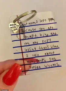 Among the posts on the fundraiser was a poignant image of a key ring with a handwritten note, seemingly penned by Jordan for Mother’s Day in May 2021, when he would have been 11 years old.