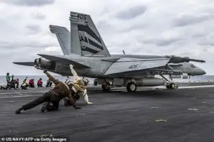 An F/A-18E Super Hornet, part of the Nimitz-class aircraft carrier USS Abraham Lincoln’s strike group, recently launched from the Arabian Sea, a routine operation that has drawn sharp attention from Tehran.