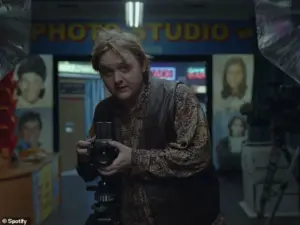 The video’s retro aesthetic is enhanced by the presence of Scottish pop singer Lewis Capaldi, 29, who appears as a photographer capturing the surreal scenes. His role adds a voyeuristic element to the story, as if the viewer is peering through the lens of a camera that distorts reality. Supporting actors include Greta Lee, 42, and Jodie Turner-Smith, 39, whose images are shown on vintage-style TV screens, reinforcing the Nineties theme. The visual design of the video—complete with grainy textures, neon hues, and period-specific fashion—has already sparked conversations on social media about the revival of retro aesthetics in modern pop culture.