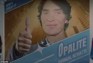 The plot takes a fantastical turn when the two characters meet, facilitated by a ‘magical’ spray bottle labeled *Opalite*. This product, which appears to be a central motif in the video, is also the namesake of Swift’s latest track. The bottle’s significance is further emphasized by the inclusion of Graham Norton, 62, in a scene promoting an unrelated spray product, while Cillian Murphy, 49, is seen in an Opalite advertisement. The juxtaposition of these promotional elements with the music video’s narrative creates a layered, meta-commentary on the intersection of celebrity culture and consumerism.