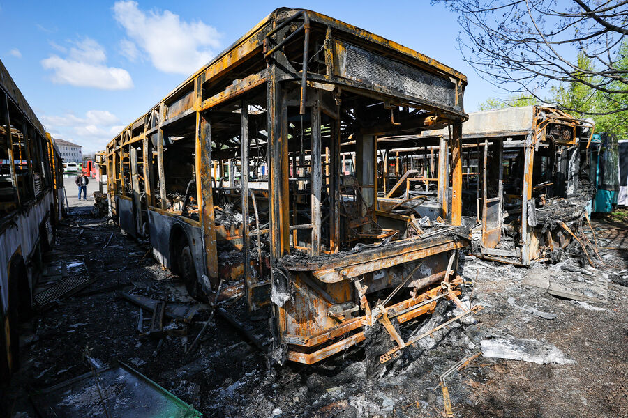 Images reveal burned-out buses with shattered windows and severely damaged bodies.